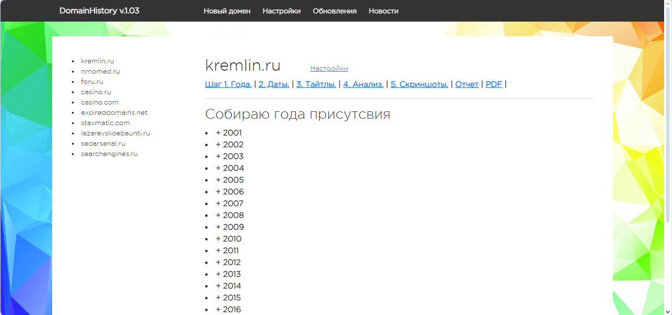 После добавления домена, с ВебАрхива подтягиваются года снимков.