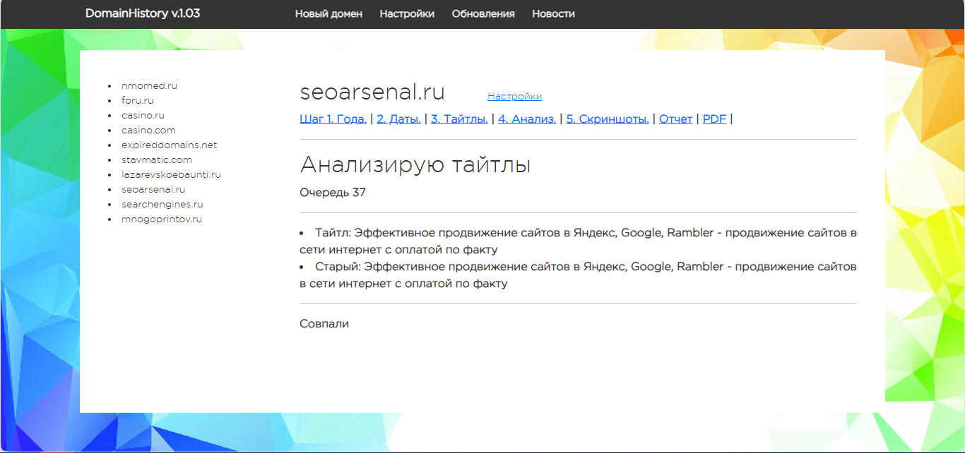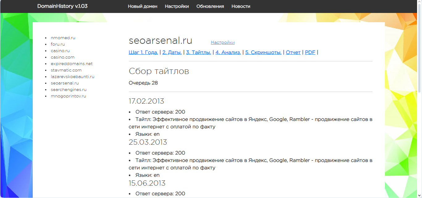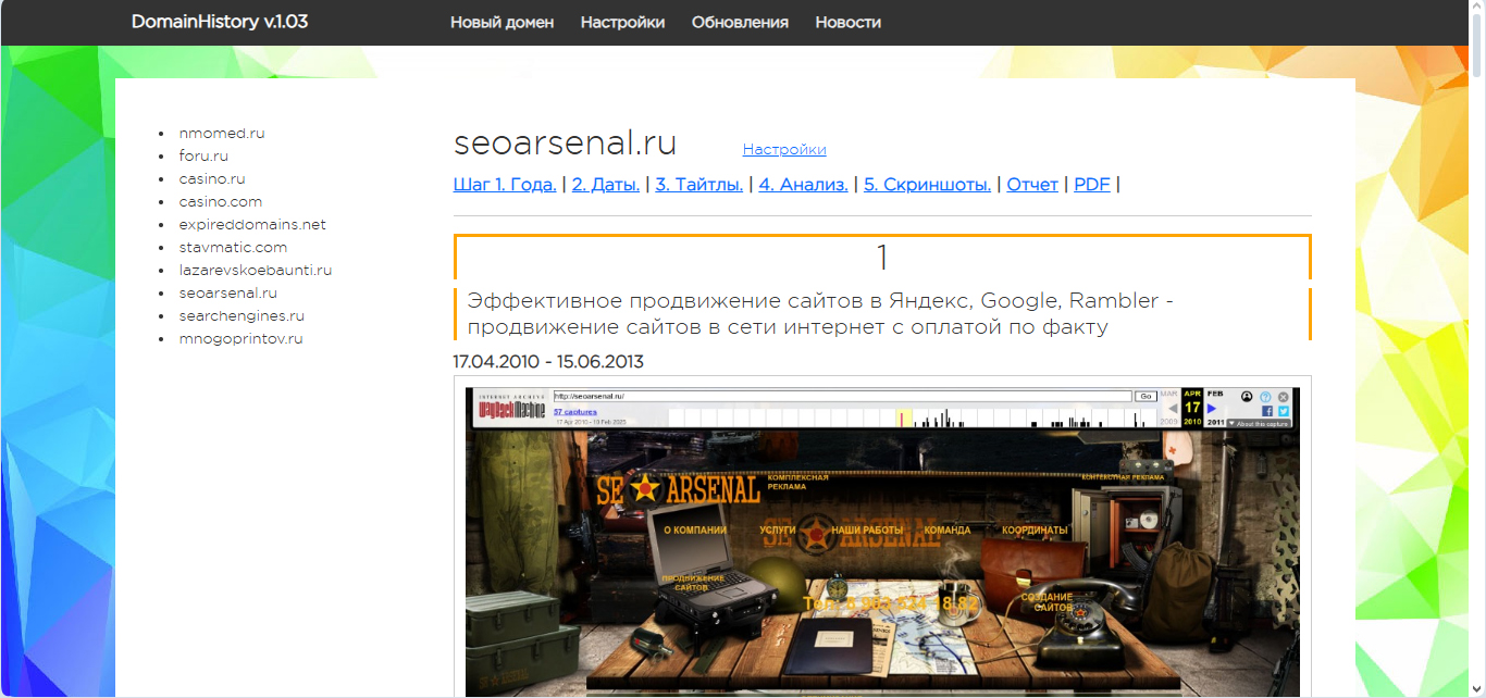 Domain History - программа для домейнеров, скупщиков дропов, web-мастеров, строителей PBN-сеток, дорвейщиков и всех тех, кто проверяет историю домена перед покупкой.