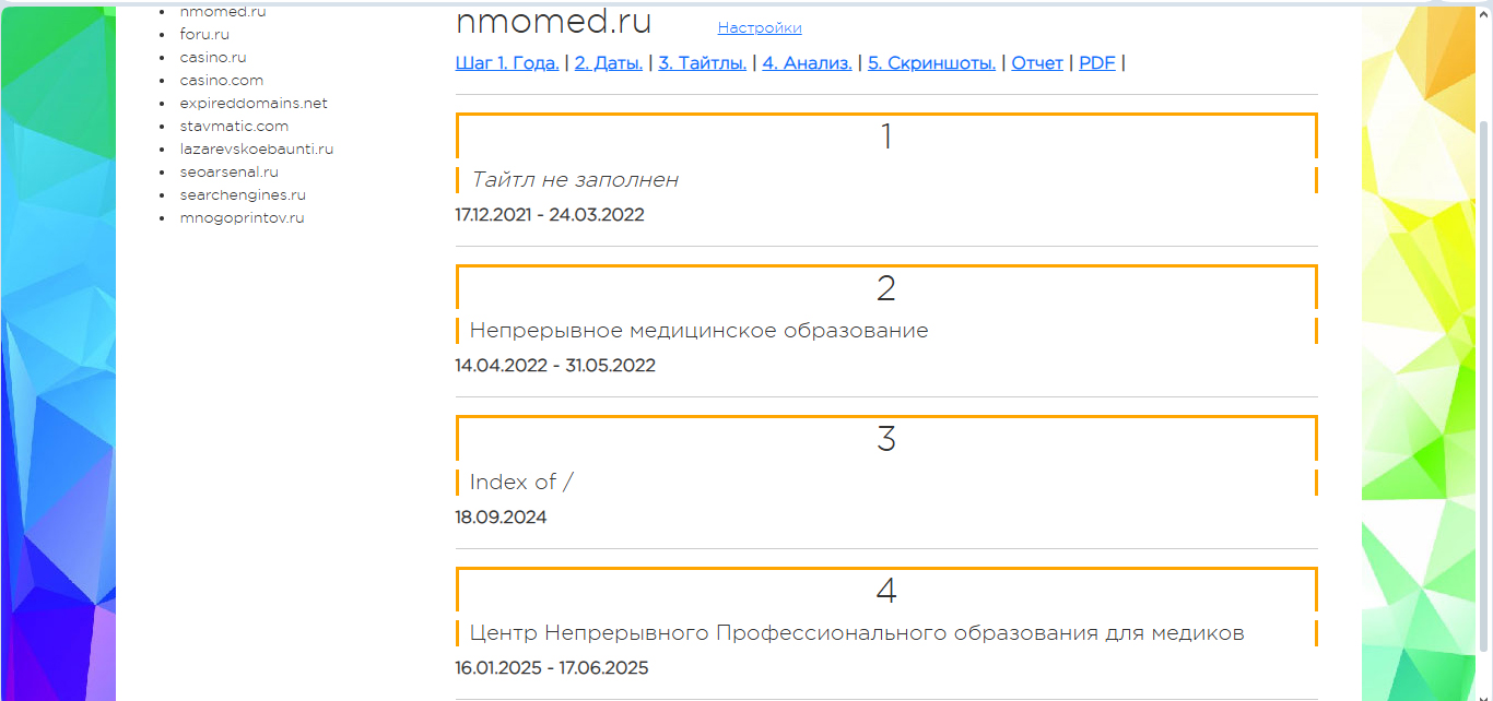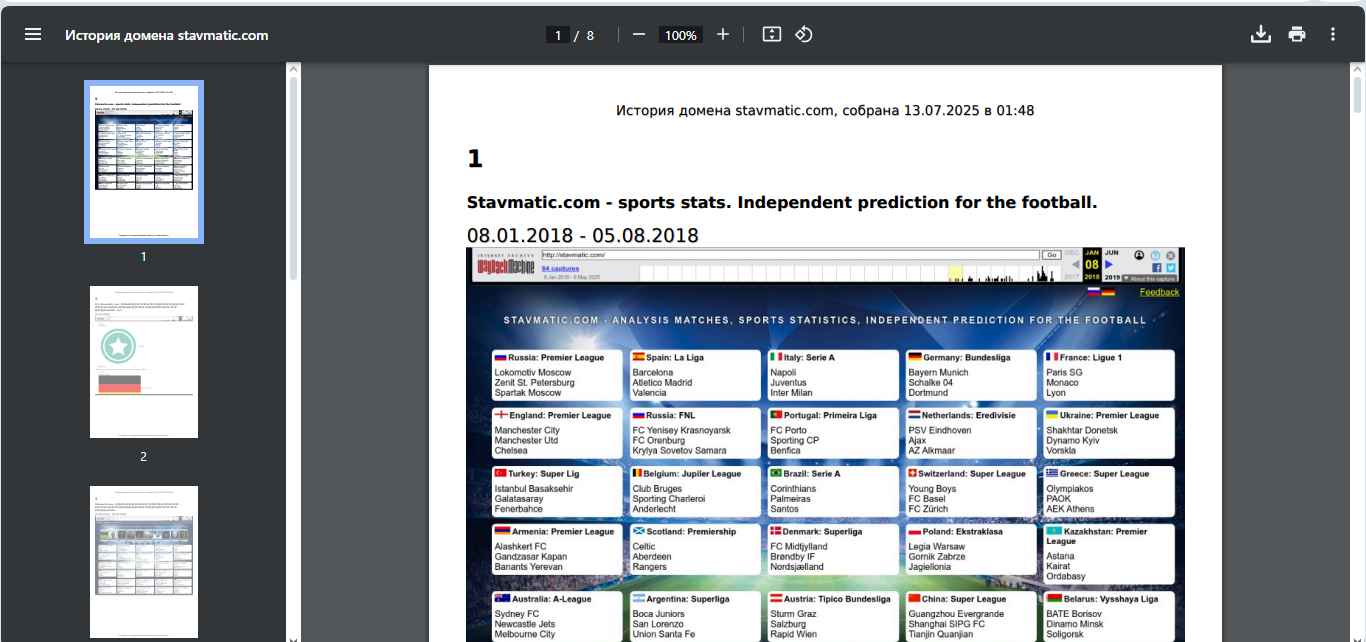 В отчете будет тайтл, даты обнаружения (период с ... по ...), наличие стоп-слов, языки контента и скрин, если снимался.