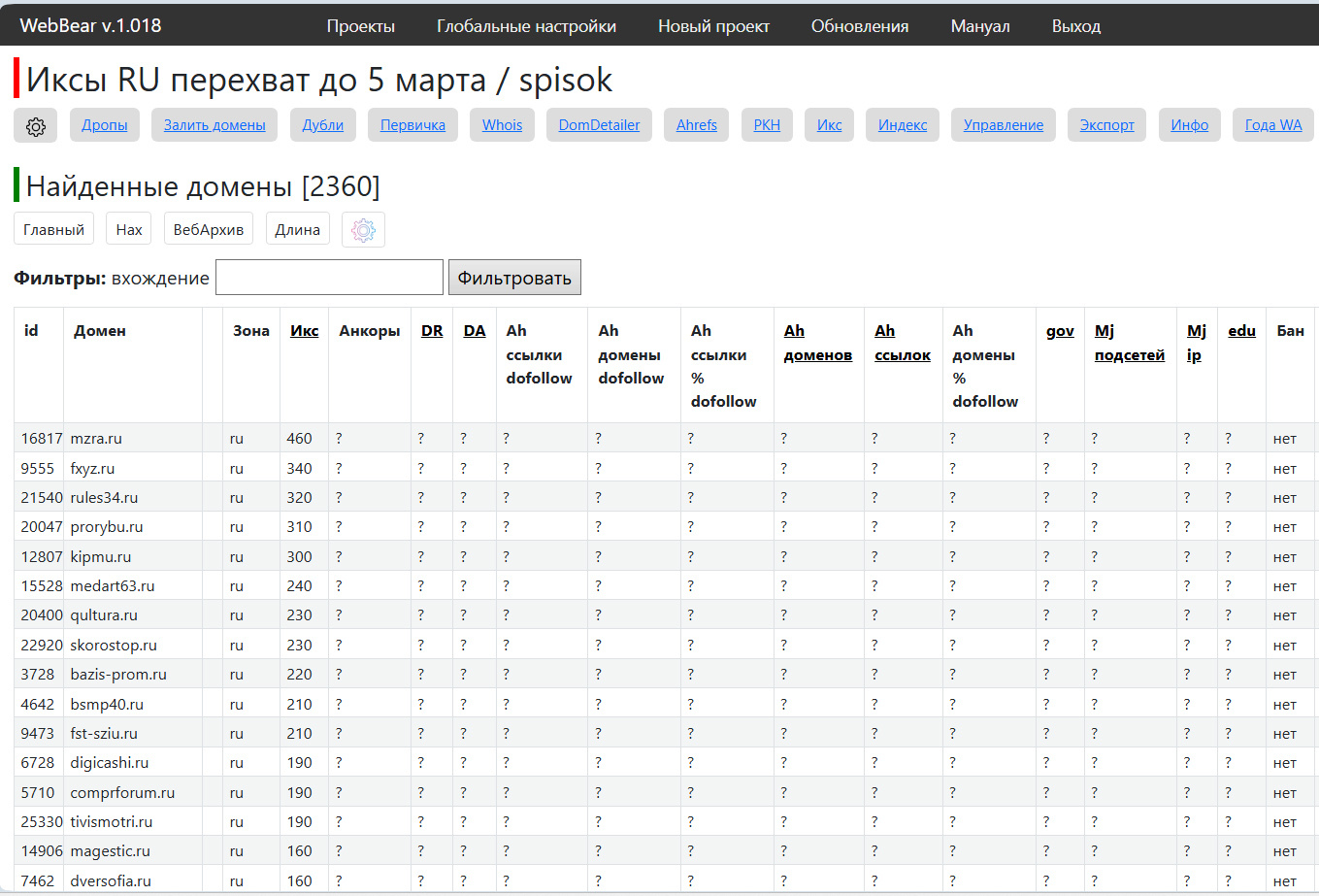 Домены с аукциона освобождающихся доменов это не совсем дропы. Фактически, домен дропается, но перед тем, как он станет доступным в паблике, происходит аукцион приоритетной регистрации. Т.е. сперва забирают жир, а потом, что осталось, уже пускают на свободную регу по номиналу. Соответственно, если нам нужны более высокие показатели, то наш путь лежит на аукцион. А как отобрать самый сок? Запустить WebBear.