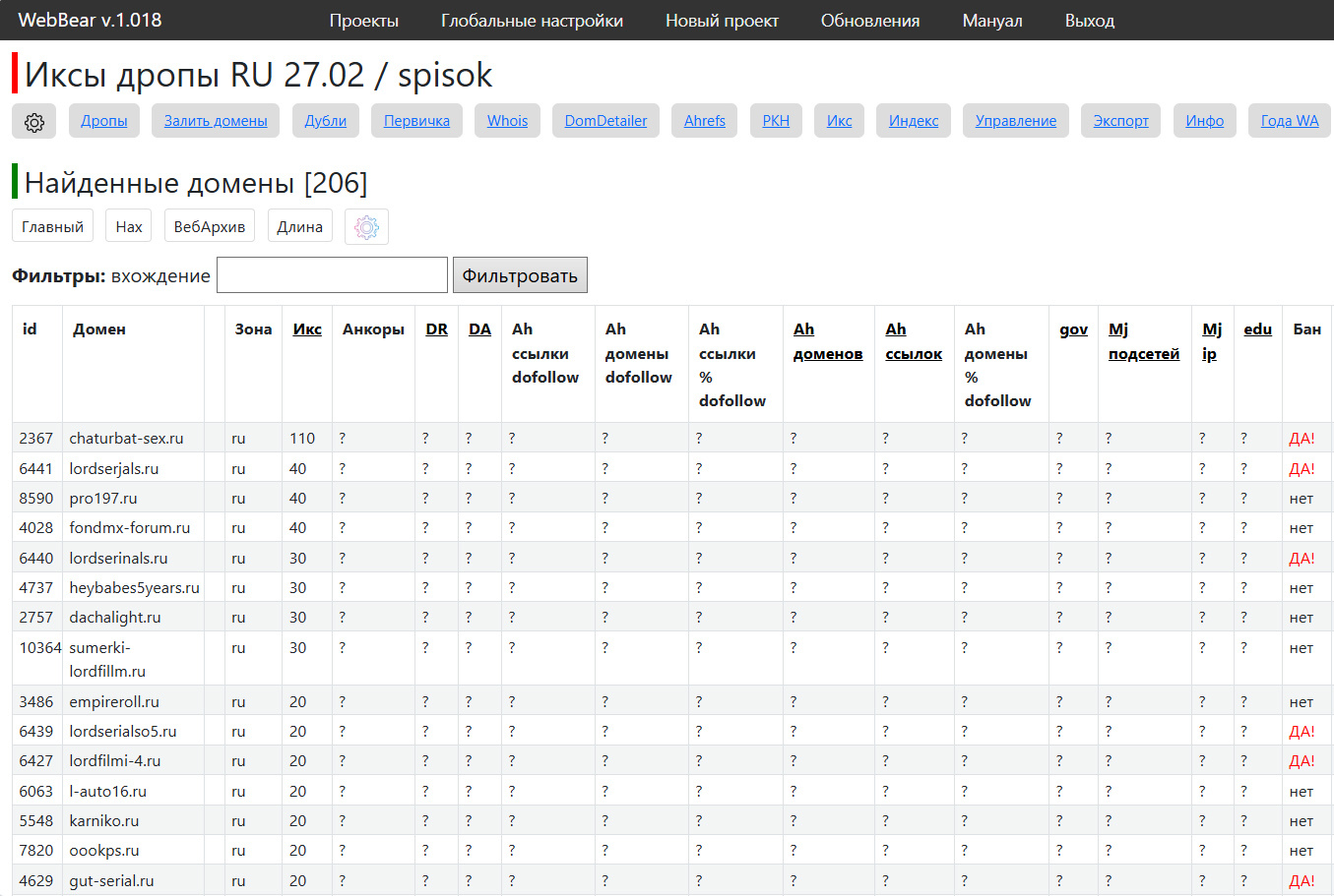 Домены с аукциона освобождающихся доменов это не совсем дропы. Фактически, домен дропается, но перед тем, как он станет доступным в паблике, происходит аукцион приоритетной регистрации. Т.е. сперва забирают жир, а потом, что осталось, уже пускают на свободную регу по номиналу. Соответственно, если нам нужны более высокие показатели, то наш путь лежит на аукцион. А как отобрать самый сок? Запустить WebBear.